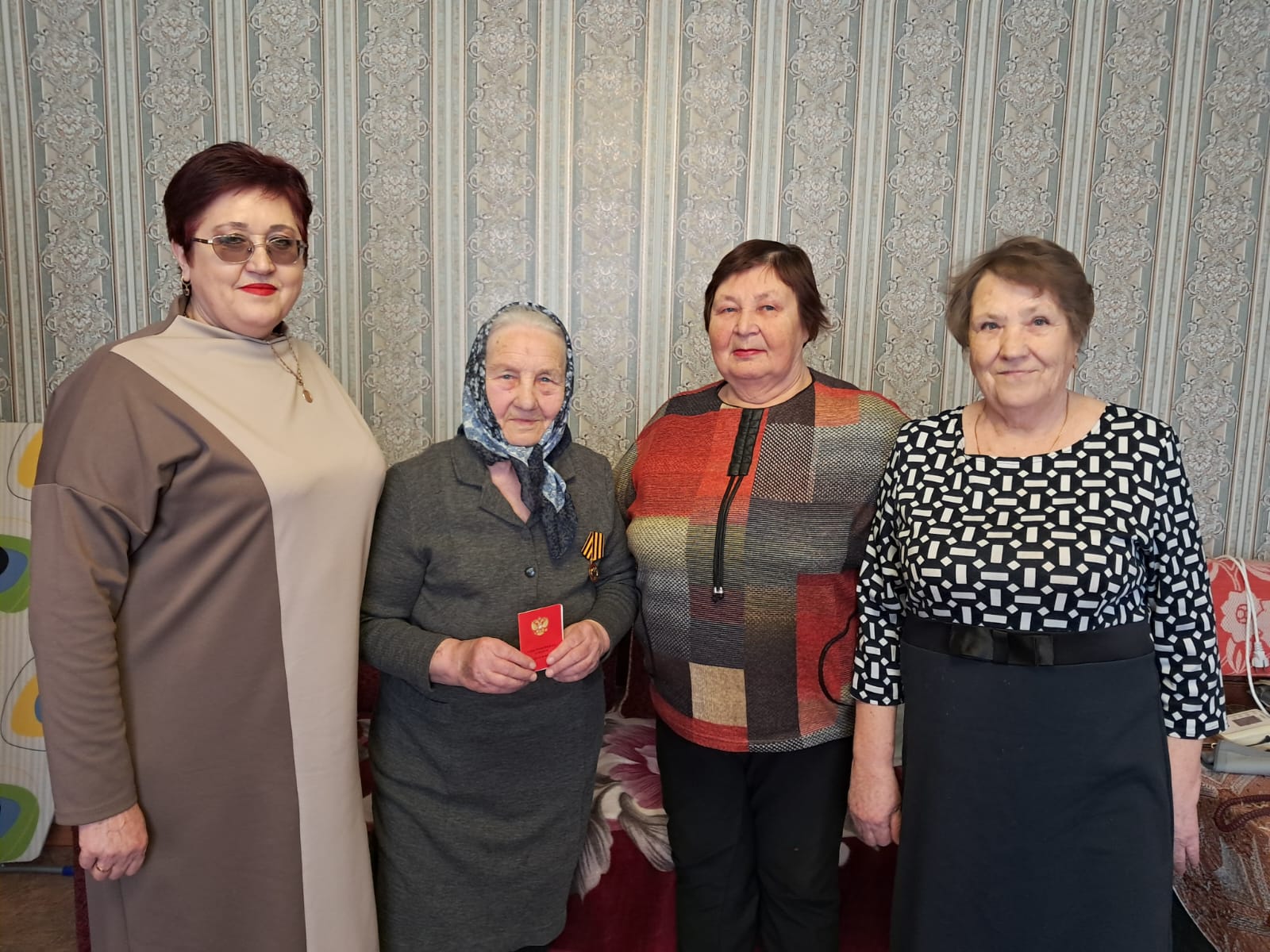 Нина Васильевна поблагодарила за медаль, за внимание со стороны ветеранской организации поселка, поделилась с гостями своими воспоминаниями о жизни, о трудовой деятельности в тяжёлые послевоенные годы, вспомнила о своих родителях, боевом подвиге отца-фронтовика.
