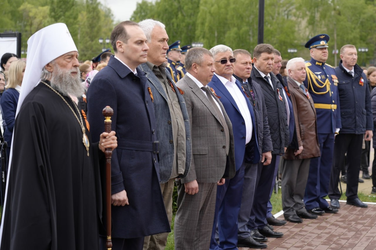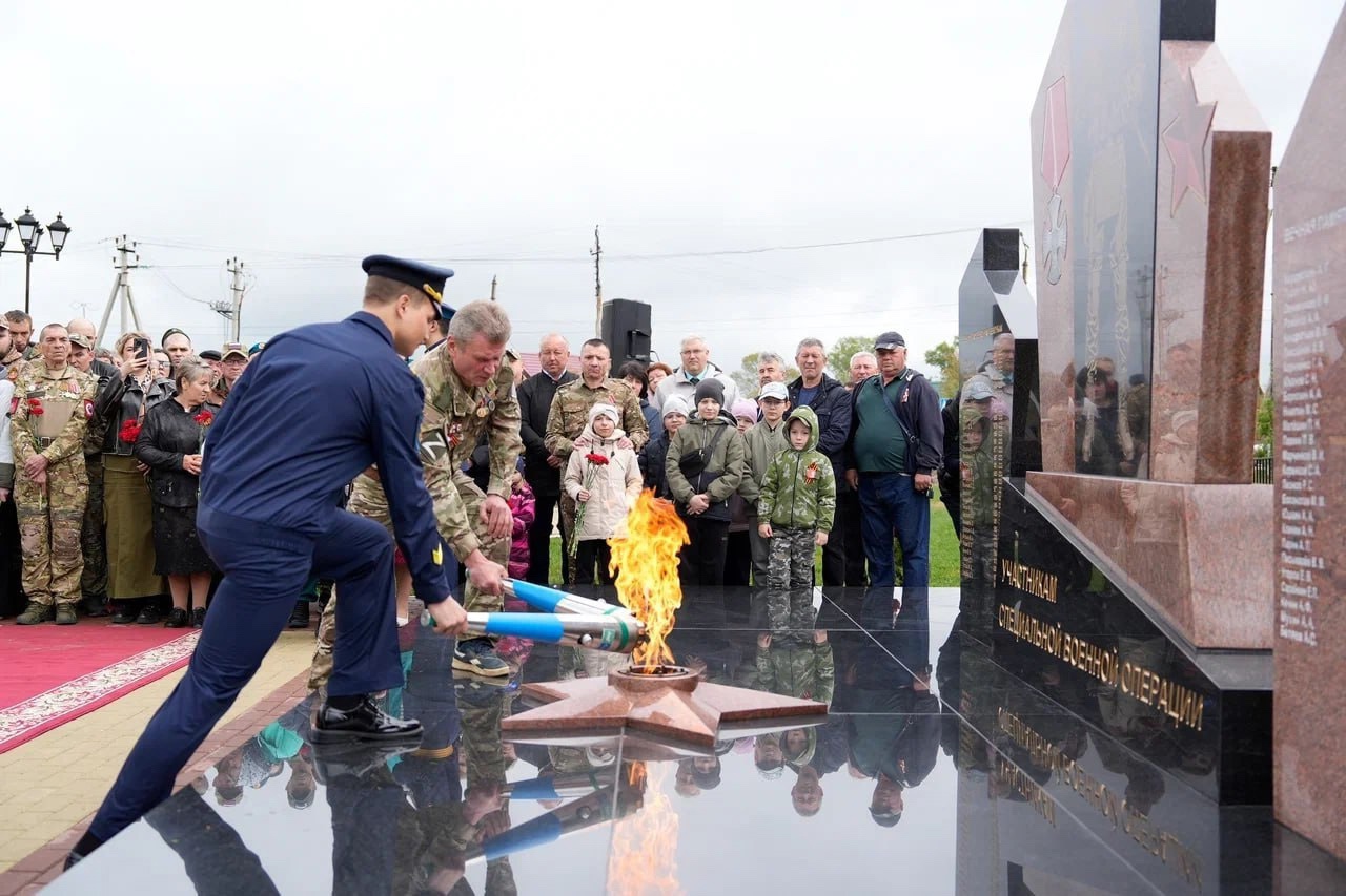 Под бурные аплодисменты со стелы были сняты белые покровы. Ветераны СВО Иван Латышев и Евгений Тиков зажгли у подножья стелы вечный огонь. Минутой молчания почтили память героев Родины.