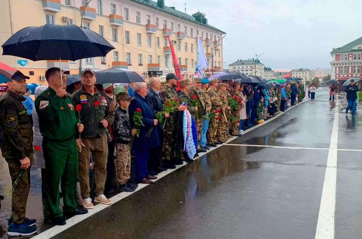 Несмотря на непогоду, на центральной площади города собрались представители органов государственной и представительной власти республики, ветеранских организаций, активисты «Молодой гвардии» Единой России, кадеты и юнармейцы.
